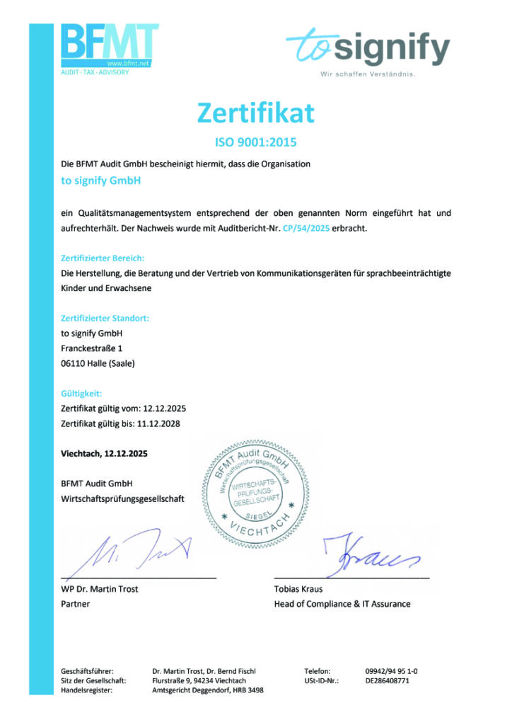 Die to signify GmbH setzt sich als Hersteller von Medizinprodukten und Anbieter im Bereich der Unterstützten Kommunikation konsequent für höchste Qualität und Kundenzufriedenheit ein. Unser Ziel ist es, die Erwartungen unserer Kunden zu erfüllen und uns durch Qualität, Umfang und Geschwindigkeit unserer Produkte und Dienstleistungen vom Wettbewerb abzuheben.